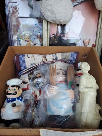 Box full of kitchen Chef items. Includes usable wood utensils. Statues that hold wood utensils, frig magnet, clock, spoon rest, italian framed picture, other cute chef figures, table chef matts n more. All in great shape.