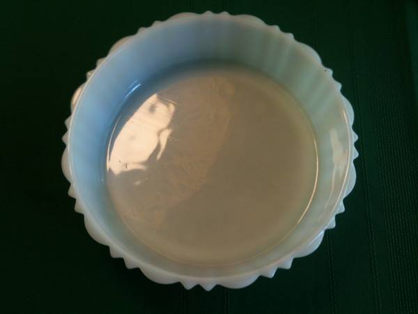 Beautiful translucent milk glass dish has ribbed design, and detailed geometric design on bottom. 6.75" diameter x 5.75"H including finial-topped lid; dish is about 1.5" deep. Tiny chip on one rib as shown in last photo; otherwise in excellent condition, and stored in a smoke-free home.